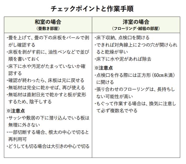 住宅が一度でも浸水したら、床下に水や泥が入り込んでいないか確認する。水や泥がたまっている場合は、早めに取り除かないと、カビが発生し、健康被害を及ぼす恐れがある。これまで被災地では、床下の結露によって腐朽した土台の木部や、汚泥に含まれる雑菌やカビが原因の呼吸器官系の健康被害の事例が多数報告されている。