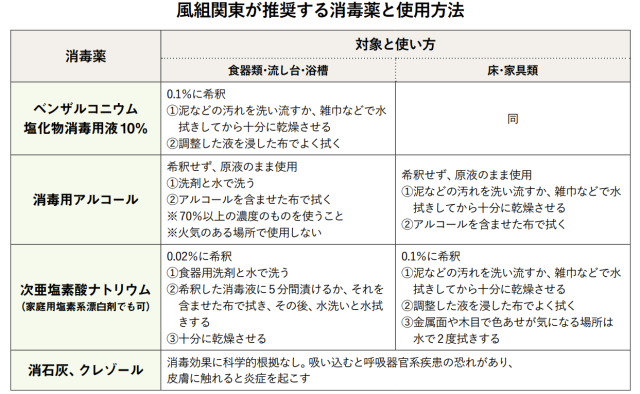 住宅が浸水した後は、カビや細菌が繁殖してしまうため、いち早く洗浄や消毒を行う。その際には、消毒薬の選定に注意が必要。市町村の災害特設サイトや企業のホームページなどに「クレゾール」や「消石灰」が紹介されているが、防疫や家屋保全の観点から、消毒効果はなく、エビデンスもないうえに、人体に影響を及ぼす危険性もある。例えばクレゾールは、希釈量を誤って使用すると、大気中の濃度が高くなったり、建材に付着した刺激臭が取れず、頭痛や呼吸器官系に悪影響を及ぼす危険性もある。風組関東では、「ベンザルコニウム塩化物消毒用液10%」「消毒用アルコール」「次亜塩素酸ナトリウム」を推奨しており、部位や使い方などにも注意している。