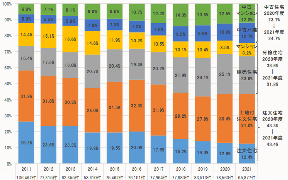 住宅金融支援機構(東京都文京区)は8月2日、2021年4月から2022年3月までにフラット35(買取型・保証型)を利用した6万5877件の属性、住宅の概要等の集計結果を発表した。利用者の取得住宅の内訳は・・・続きはこちら
