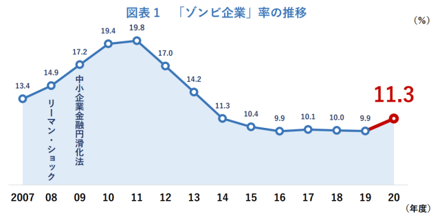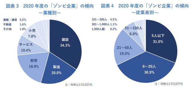 帝国データバンクは7月27日、実質的に倒産状態であるにも関わらず営業を継続している、いわゆる「ゾンビ企業」が、2020年度は全企業の11.3%、約16.5万社と推計した分析結果を公表した。このうち、業種別では「建設」が34.3%で最も多かった。