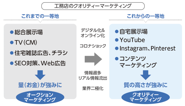 現在は質の高いコンテンツをHP・SNS・動画、メルマガなどの無料メディアで発信すれば、興味・共感をもった理想の顧客候補がアプローチしてくれ、見学会や販売型/自宅展示場などのリアルな場で体感・確認できれば契約に至る、「クオリティーマーケティング」が可能になった。