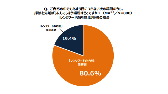 「自宅であまり目につかない場所のうち、掃除を先延ばしにしてしまう場所」を複数回答で聞いたところ、80.6%が「レンジフードの内部」と回答した。「最も掃除を先延ばしにしてしまう場所」(単一回答)としても「レンジフードの内部」(46.5%)が1位となった。2位は「エアコンの内部」(13.9%)、3位は「窓のレール」(11.1%)だった。