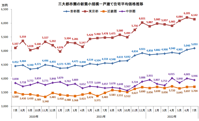 首都圏(1都3県)の平均価格は、前月比1.1%増の5093万円で2カ月連続上昇した。東京都は同1.0%減の6142万円と3カ月ぶりに反転下落。神奈川県も同1.6%減の4491万円と反転下落した。千葉県は4514万円(同11.4%増)、埼玉県は4255万円(同2.2%増)と、ともに2カ月連続上昇。6月は全面高と回復基調を示したが、7月は東京都・神奈川が下落し、伸びの鈍化が見られた。