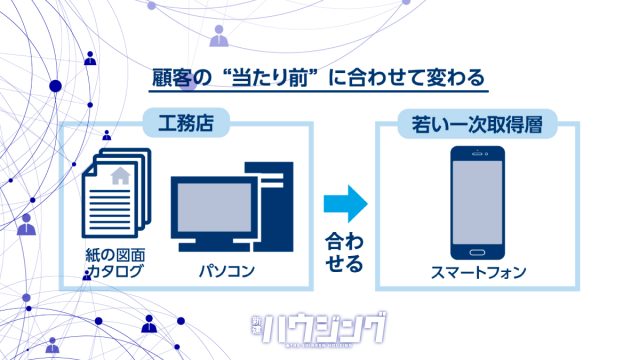 社員は「図面にしてもパソコンの大画面で見るのを好む」のに対し、若い顧客は「スマートフォンの画面で確認することが前提になっている」。印刷した図面や資料をめくりながらの打ち合わせを、今の一次取得層に合わせたスタイルに転換する必要があった。