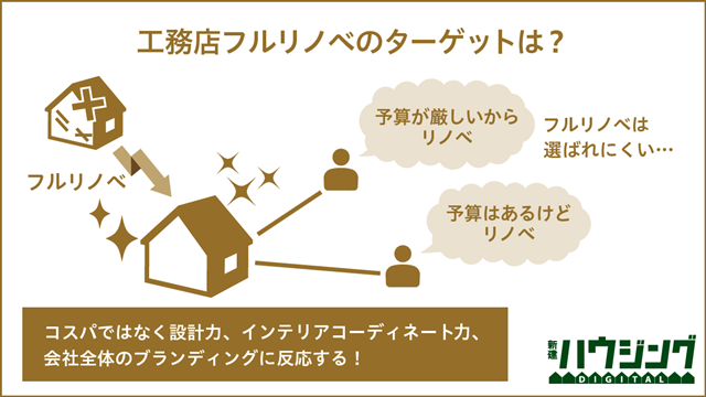 弊社のクライアントには、いわゆる性能向上を含めたフルリノベで結果を出している工務店が何社かあります。全面改修するなら見た目だけでなく、断熱改修という見えないところをやるべき!という想いが支持されて行列ができているわけですが、新築である程度ブランドができているとリノベに展開していった場合でも割と市場から支持が得られやすいようです。
