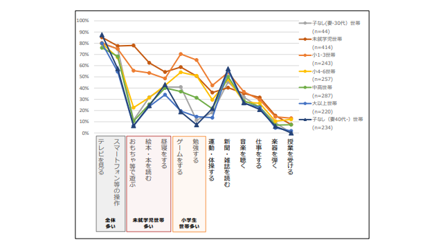 LDKでの過ごし方・使い方としては、末子が小学生までの世帯では「おもちゃなどで遊ぶ、「絵本、本を読む」、「勉強をする」などが多く、妻の在宅勤務の場所として使われているケースも多かった。このことから、LDKは子どもの見守りや共に過ごす場としての用途で用いられていることがわかる。一方、中高生以降では、「スマートフォンなどの操作」、「新聞、雑誌を読む」、「昼寝をする」など個人がリラックスする用途で用いられており、ここでは勉強する割合は低いことがわかった。