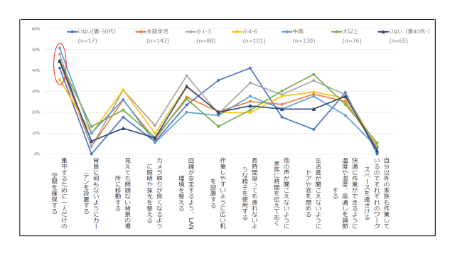 コロナ禍において在宅勤務をする人が増えていることから、良質な在宅勤務環境を確保するために取り組んでいることを調査したところ、どの年代の子どもを有していても最も多かった回答は「集中するために一人だけの空間を確保する」というものだった。子どもが小さいうちはLDKなどで子どもを見守りながら在宅勤務を実施する人が多かったが、ウェブ会議などもあり、一人だけの空間を確保するニーズは高い。また「快適に作業ができるように温度や湿度、風通しを調整する」や「生活音が聞こえないようにドアや窓を閉める」などのニーズも高いことがわかった。感染拡大前後の屋外空間の利用実態を調べたところ、感染拡大後は、庇の有無にかかわらず、仕事のために利用する人の割合が増加していることがわかった。これらの結果から、屋内空間のみならず、屋外空間についても、仕事や気分転換、子どもが非日常を体験できる空間設計が求められているとする。