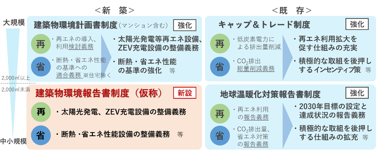新築の大規模建物については「建築物環境計画書制度」を改正し、建物や敷地への環境配慮措置や評価を記載した環境計画書の提出を義務付ける。他に、▽省エネルギー性能基準(断熱・省エネ)への適合▽再エネ利用(再エネ設置・再エネ電気調達)の検討▽「マンション環境性能表示」の表示―なども求める。