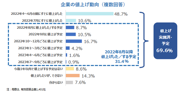 8月以降に「値上げした/する予定」の企業は合わせて31.4%で、「4~6月」「7月」にすでに値上げした企業も含めると、「値上げ実施済・予定」企業は69.6%と約7割にのぼる。