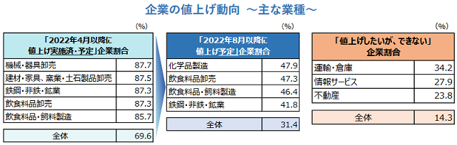 値上げを実施済・予定している企業の割合を業種別にみると、「機械・器具卸売」87.7%、「建材・家具、窯業・土石製品卸売」87.5%などで値上げが進んでいる。8月以降は「化学品製造」47.9%、「飲食料品卸売」47.3%などが全体(31.4%)を大きく上回っており、川下産業および家計への影響が懸念される。