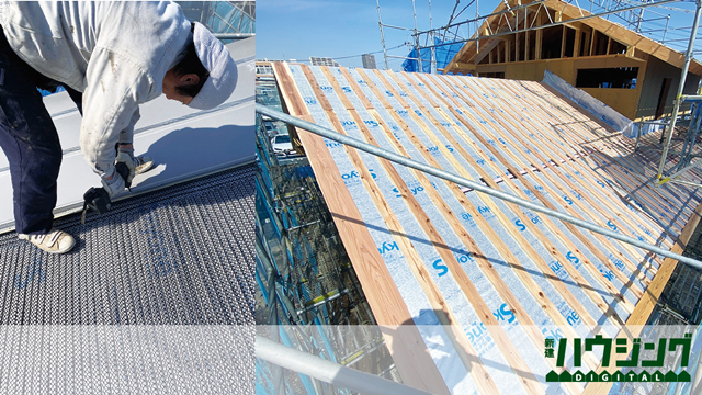 落合さんは、オリジナルの樹脂製通気胴縁を合わせて開発・販売することにこだわった。施工を容易にして、透湿ルーフィングに義務付けられている屋根通気のメリットを広げたい考え。落合さんは「まだ現場の9割が屋根に通気層を設けていない」と問題点を指摘。「壁に通気を取るのが当たり前になったのだから、壁の通気層から上がっていく・・・