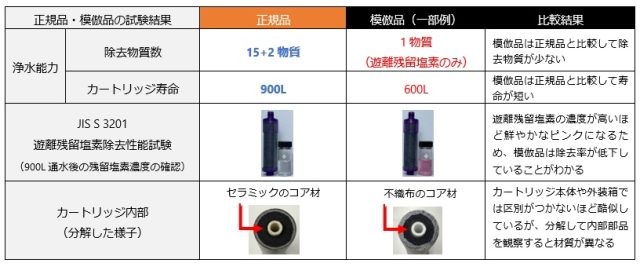 一部のフリーマーケットサイト、オークションサイトのほか、大手ショッピングサイトでも、偽物の販売が報告されたケースがあったという。報告のあった浄水栓カートリッジの現物を確認したところ、外見は酷似しているが、「内部の材質・形状が一部異なり、記載されている物質を除去できない」「カートリッジ寿命が短い」といったことから、LIXILの名をかたる悪質な偽物であることが判明した事例もあった。