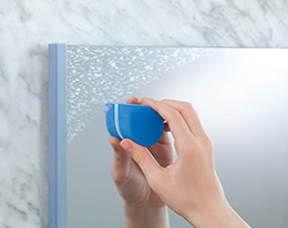 新製品は、高精細表面テクノロジーと鏡にキズをつけない特殊研磨粒子により、水滴をつけてこするだけで水あか落とすことが可能。研磨面はピラミッド形状のため目詰まりしにくく、研磨力が長続きする。