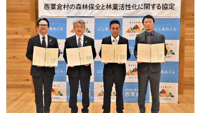 ライフデザイン・カバヤ(岡山市)はこのほど、西粟倉村、西粟倉百年の森林協同組合(岡山県英田郡西粟倉村)、エーゼロ(岡山県英田郡西粟倉村)、西粟倉・森の学校(岡山県英田郡西粟倉村)の5者で「西粟倉村の森林保全と林業活性化に関する協定」を締結した。