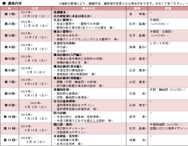 講師に泉幸甫氏、松本昌義氏、高橋昌巳氏、山辺豊彦氏、日高保氏、山田貴宏氏、安井昇氏、後藤治氏を迎え、各氏の専門分野に応じて、間取りから構造、温熱、防火、建築史まで幅広く学ぶ。