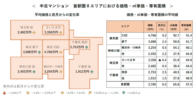 首都圏全体の1戸あたりの平均価格は3785万円で、前月比0.5%上昇。8エリア全てで13カ月連続前年同月超えとなった。前月比プラスとなったのは7エリアで、うち4エリアで上昇率が1.5%以上となるなど、全体的な上昇傾向が継続している。