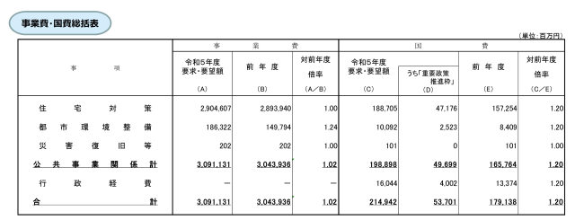 来年度は、1.住宅・建築物におけるカーボンニュートラルの実現、2.住まい・くらしの安全確保、良好な市街地環境の整備、3.誰もが安心して暮らせる多様な住まいの確保、4.既存ストックの有効活用と流通市場の形成、5.住宅・建築分野のDX・生産性向上の推進―を重点施策とする。要求額は住宅対策に前年度とほぼ同額の2兆9046億700万円、都市環境整備に同1.24倍の1863億2200万円など。
