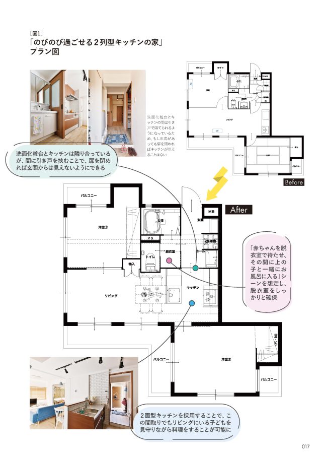 そこで2児の母である彦坂さんは、自身の子育て経験を生かしながら、①脱衣室は着替えのみに特化して広さをしっかりと確保し、②洗面化粧台は廊下に出し、③キッチンの間を抜ける形にはなるが2列型キッチンにして子どもを見ながら料理ができるようにする、というプランを提案した。