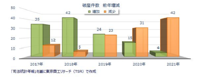 破産件数を都道府県別にみると、前年を上回ったのは群馬県894件(前年比6.8%増)、沖縄県802件(同4.4%増)、千葉県3796件(同3.5%増)、神奈川県5583件(同1.1%増)の4県。前年と同数は秋田県のみで、減少したのは42都道府県にのぼる。コロナ前の2019年は増加(24道県)が減少(23都府県)を上回っていたが、コロナ禍の政策効果により2020年から減少と増加が逆転、破産件数が前年比プラスの県が大幅に減少した。減少率が最も大きかったのは、山梨県の前年比21.0%減(500→395件)。次いで、大分県が同17.8%減(806→662件)、富山県が同17.4%減(436→360件)だった。2年連続で破産が増加した都道府県はゼロ、2年連続で減少したのは26都道府県だった。