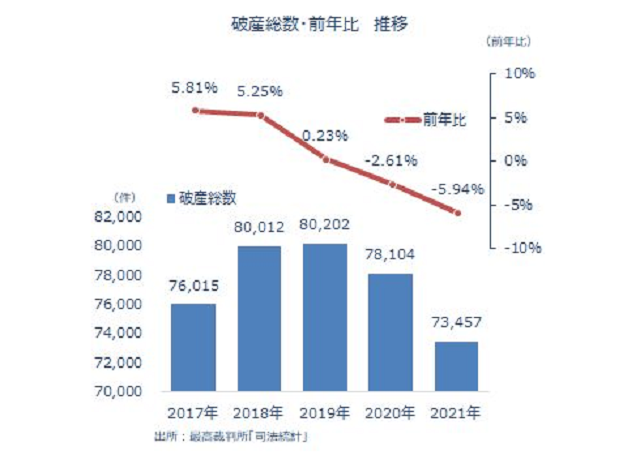 東京商工リサーチ(東京都千代田区)は9月1日、2021年の「破産新受事件」に関する状況調査の結果を発表した。司法統計によると、2021年の全国の地方裁判所で受理した法人・自然人の破産新受事件は、前年比5.9%減の7万3457件で2年連続減少。前年に続き8万件を下回り、2017年(7万6015件)からの5年間で最少となった。破産件数は、2019年まで消費税率引き上げや景気後退などにより年々増加していたが、2020年は新型コロナ感染拡大に伴う各種助成金や資金繰り支援策の施行により前年比2.6%減少。2021年はさらに減少率が拡大した。破産の内訳は、自然人(個人・個人企業)が6万8413件(前年7万1838件)、法人・その他が5044件(同6266件)で、自然人が93.1%を占めている。