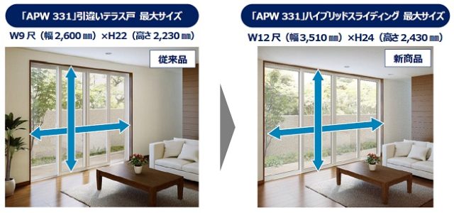 「APW331」は、樹脂窓「APW330」のうち、テラス戸や勝手口など人の出入りを目的にした商品カテゴリ。ここに、最大でW12尺(3510mm)×H24(2430mm)の大開口が可能になる新機種として「ハイブリッドスライディング」が加わる。