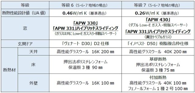 もう1つの大きな特徴は、10月1日に施行される住宅性能表示制度の断熱等性能等級の上位基準である6、7に対応する窓として設計されていること。等級6に対応するためには窓単体でU値1.7を切る必要があり、これをアルミ樹脂複合窓で達成するのは難しいことから、今回のように樹脂障子とアルミ樹脂複合枠を組み合わせることを思いついた。同社では、等級6、7への適合例として[下表]のような仕様を示しており、リビングのテラス戸を今回のハイブリッドスライディングとし、その他の窓をAPW330またはAPW430で構成することで対応できるとしている。