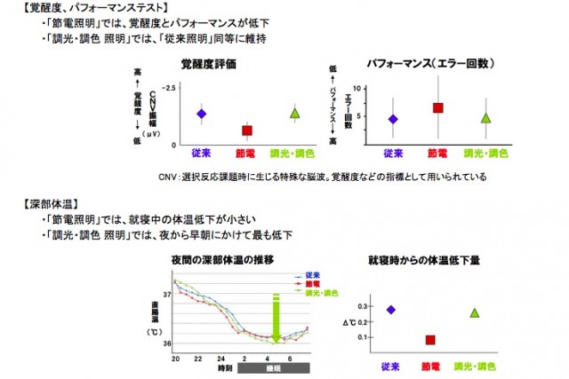その結果、「節電照明」では日中の覚醒度と作業効率が低下(エラーが増加)し、夜間の体温が十分低下しないことがわかった。一方、「調光・調色照明」では日中の「従来照明」と同等の覚醒度・作業効率を維持し、かつ夜間の体温の低下量とメラトニンの分泌量が最も多いことが明らかになった。