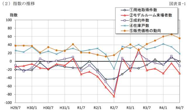 住宅・宅地分譲業に関して、「用地取得件数」の指数は、前回から9.1ポイント下落し、0.0ポイント。「モデルルーム来場者数」の指数は、前回から24.7ポイント下落し、-29.2ポイント。「成約件数」の指数は、前回から23.9ポイント下落し、-11.1ポイント。「在庫戸数」の指数は、前回から16.5ポイント下落し、18.5ポイント。「販売価格の動向」の指数は、前回から9.6ポイント下落の55.6ポイントとなり、2012年7月調査以降41期連続して、上昇傾向にあるとの見方が多い状況が続いている。
