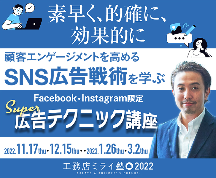 SNSを活用して家づくりの情報収集をする住まい手が増える中、自社の住宅の魅力や世界観を伝えるためSNSを活用し情報発信に力を入れる工務店が増えています。お客さまの心をつかむ写真やお役立ち情報のネタ探しは大変な作業ですが、投稿するだけでなく、Facebook・Instagram広告を目的に合わせて出稿すると、自社の魅力を伝えながら効率よく見込み客を集めることが可能になります。