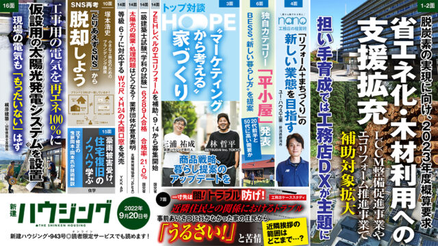 そのほか、梶原建築(山梨県富士吉田市)が、2019~2021年に取り組んだリノベーションで、太陽光で発電した電力だけで工事することにチャレンジした事例や、住宅ブランド「BESS」をFC展開するアールシーコア(東京都渋谷区)が、新しい暮らし方として提案する小屋×平屋×ログハウスの「平小屋」を詳報します。