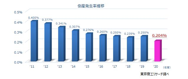東京商工リサーチ(東京都千代田区)はこのほど、2020年度「倒産発生率(普通法人)」調査の結果を発表した。2020年度の倒産発生率は前年度比0.046ポイント減の0.204%で、2011年度以降の10年間で最低となった。リーマン・ショックで倒産発生率が0.532%を記録した2008年度以降、中小企業金融円滑化法(2009年)の施行などで倒産発生率は低下を続けたが、2019年度は消費増税や人手不足で11年ぶりに企業倒産が増加していた。2020年度は新型コロナ感染拡大に対する各種資金繰り支援などの効果が広く浸透し、企業倒産が大幅に抑制されたことが明らかとなった。
