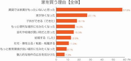 それによると、全体では、第1位「賃貸では家賃がもったいないと思った」(57.8%)を理由に挙げた人が最も多く、すべての世代でトップとなった。次いで、第2位「家が狭くなった」(27.1%)、第3位「子供ができる、できた」(18.1%)と続いた。