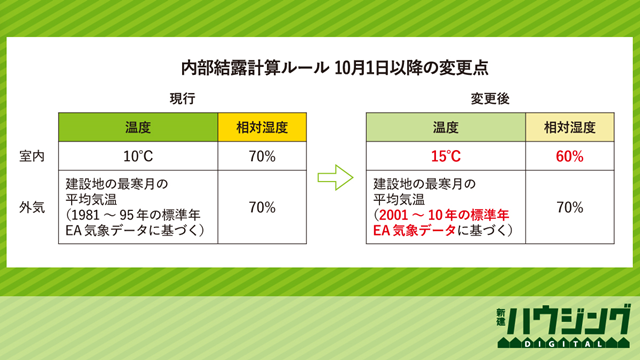 今回変更されるのは、①室内条件(温度、相対湿度)②標準年気象データの2点。①は、10℃・70%から、15℃・60%となる[表]。②は、外気条件となる最寒月の平均気温として用いる標準年拡張アメダス(EA)気象データを、1981~1995年のデータ(842地点)から、2001~2010年836地点)のものに変更する。