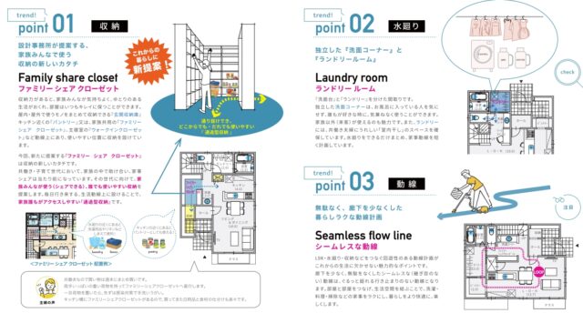 共働き・子育て世代に向けた「家づくり」にポイントを絞り、収納や水廻り、動線にこだわりのある人気の間取りを提案する。今回、収納の新しいカタチとして、家族共用の「ファミリー シェア クローゼット」を追加。生活動線上に設けた「通過型収納」で、家族で助け合い、家事シェアが当たり前な同世代が使いやすくなっている。
