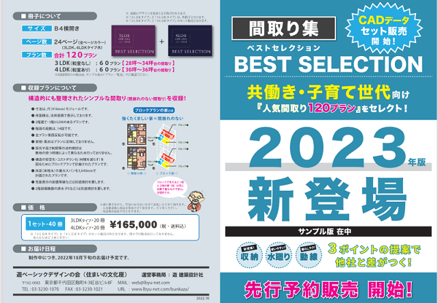 遊建築設計社が運営する遊ベーシックデザインの会(東京都千代田区)は、2023年の流行を先取りした新・間取り集「ベストセレクション2023」を10月下旬に発売する。
