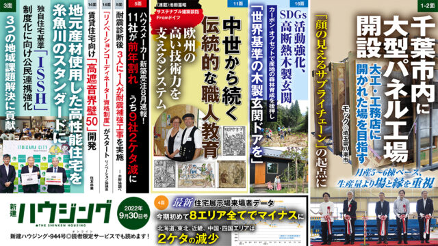 最新9月30日号の「新建ハウジング」トップ記事は、山長グループのモック(埼玉県八千代市)が、今夏に千葉市内に開設した大型パネル工場について取り上げます。9月8日に開いたお披露で、同社社長の榎本哲也さんは挨拶し、「(生産)数よりもここから派生するもの・価値を大事にしたい」とコメント。単なるパネル生産施設を超えて、工務店を含むサプライチェーン全体への波及効果を期待します。