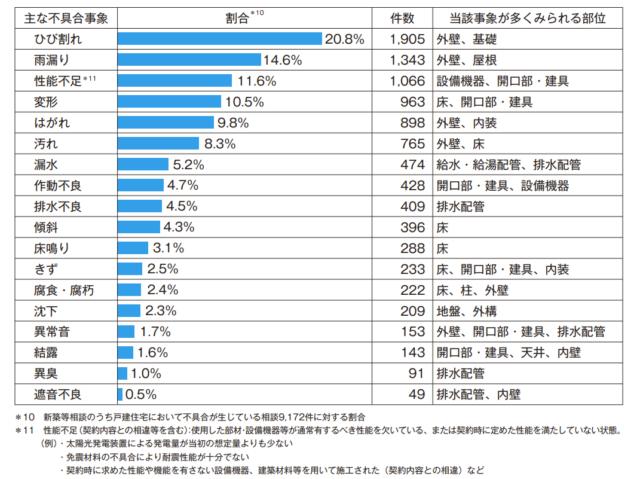 住宅のトラブルに関する相談のうち、「新築等相談」で雨漏りやひび割れなどの不具合が生じている相談は1万1216件で76.0%を占める。不具合事象は戸建て住宅と共同住宅等がともに「ひび割れ」(戸建て20.8%、共同等13.6%)が最も多く、戸建て住宅では「雨漏り」(14.6%)、「性能不足」(11.6%)が続く。共同住宅等では「性能不足」(11.7%)、「はがれ」(11.6%)が続いた。