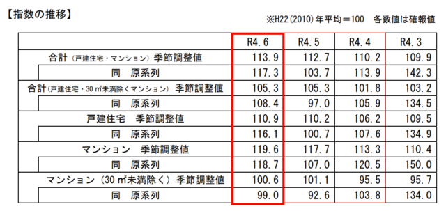 国土交通省は9月30日、登記データをもとに個人が購入した既存住宅の移転登記量を加工・指数化した「既存住宅販売量指数」(4~6月分)を公表した。6月の戸建て・マンション合計・季節調整値は前月比1.0%増の113.9、床面積30㎡未満を除いた合計・季節調整値は前月比0.0%の105.3だった。このうち、戸建住宅の季節調整値は前月比0.6%増の110.9となっている。
