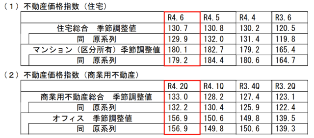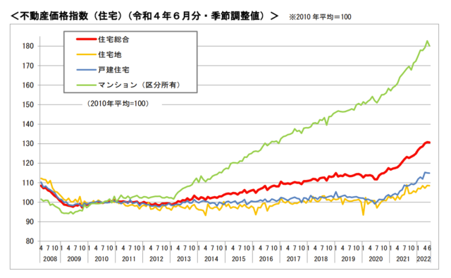 国土交通省は9月30日、2022年6月分の不動産価格指数(季節調整値)を公表した。2010年平均を100として算出したもので、全国の住宅総合は前月比0.1%減の130.7となった。住宅地は同0.1%減の108.4、戸建住宅は同0.1%減の114.9、マンション(区分所有)は同1.4%減の180.1だった。