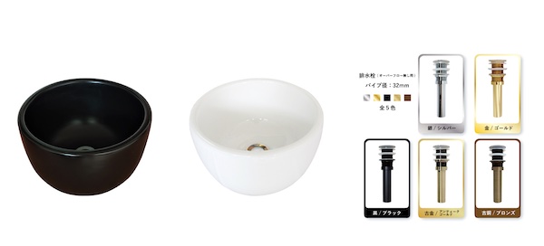 幅300×奥行300×高さ180mm。マットブラックが税込2万9700円、ホワイトが税込1万6500円。付属の排水栓はシルバー、ゴールド、ブラック、アンティークゴールド、ブロンズの5色から選べる。