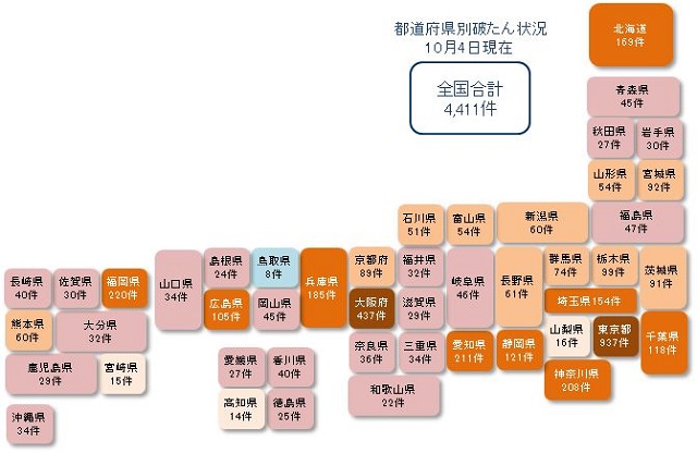 東京商工リサーチ(東京都千代田区)は10月4日16時時点で、「新型コロナ」関連の経営破たん(負債1000万円以上)が、全国で累計4196件(倒産4062件、弁護士一任・準備中134件)にのぼったと発表した。負債1000万円未満の小規模倒産を含めると累計4411件。