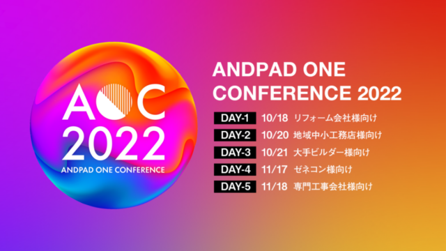 施工管理アプリ「ANDPAD」を展開するアンドパッド(東京都千代田区)は10月18、20~21日、11月17~18日に、ユーザーを対象とした『ANDPAD ONE CONFERENCE 2022』をオンライン開催する。3回目となった今回のテーマは「多彩な進化を遂げる建設DX」。工務店や大手ビルダー、リフォーム会社など、あらゆる業界で進化を続けるリーディングプレイヤーや有識者が登壇し、最先端のDXを5日間にわたって届ける。