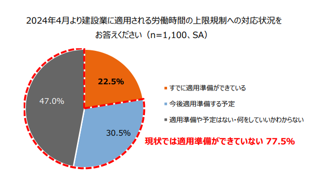 2024年4月から建設業に適用される『労働時間の上限規制の対応状況』について聞いたところ、「すでに適用準備ができている」は約2割(22.5%)にとどまった。半数近く(47.0%)が「適用準備や予定はない・何をしていいかわからない」と回答し、「今後適用準備する予定」(30.5%)と合わせると8割近くが現時点では適用準備ができていないことがわかった。なお、「すでに適用準備ができている」の回答率の最多は、炉や窯の建設工事や熱絶縁、道路標識設置や井戸の掘削などの工事を行っている「その他の設備工事業」(43.8%)だった。「今後適用準備をする予定」は「舗装工事業」(41.7%)が最多、「適用準備や予定はない・何をしていいかわからない」は、「大工工事業」(69.6%)が最も高い結果となった。