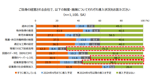 経営している会社での『導入が難しい働き⽅や生産性向上に関する制度や施策』について聞いたところ、「週休2日制」(39.4%)や「適正な工期の設定」(26.5%)など、働き⽅とスケジュールに関連する項目の回答率が高い結果となった。「現場でのICT技術活用」(33.5%)も3割を超えた。導入が難しい理由を聞いたところ、「週休2日制」と「適正な工期の設定」では、「顧客理解が得られないから」という理由が最も多く、どちらも5割を超えた。「現場でのICT技術活用」については、「導入を主導できる人材がいないから」(47.4%)が最多となった。