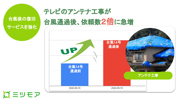 甚大な被害をもたらすような台風の通過後は復旧関連工事の依頼が多く、最強クラスの暴風を伴った台風14号の際は、アンテナ修理依頼が前日の2倍以上になったという。同サービスではこのほか、屋根や雨漏りの修理、窓ガラスやドアの交換・修理、フェンス・塀の外構工事などにも対応している。