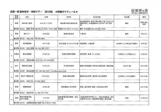 NPO 法人・環境共生住宅「地球の会」は、全国各地の会員工務店で一斉の森林見学・体験ツアーを開催する。 各地の会員工務店が主催し半年に1度一斉に取り組んでいるもの。今回は8社により、全国の地場工務店や一般消費者を対象に、山の見学や伐採・間伐の体験、加工場・プレカット工場の見学などを行う。