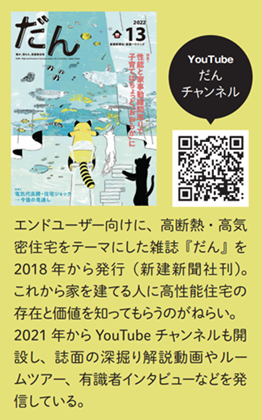同時に、エンドユーザーにも樹脂窓の価値を届けるために1年がかりで準備を進め、2018年に発行にこぎつけたのが高断熱住宅雑誌『だん』で、昨年からYouTubeチャンネルも始めました。