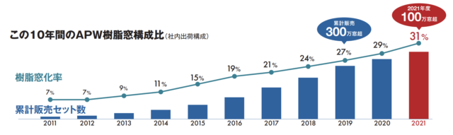 山田 もっと言うと、「APW430」は本格派の窓であると同時に、日本流の独自の進化も遂げています。大きな特徴は、半外付けの納まりと窓種の豊富さ。また、同じ2014年に「APW330」の防火窓を発売して都市部の樹脂窓需要を後押ししたことも、発売当初は7%しかなかった樹脂窓構成比が右肩上がりで伸びるきっかけになりました。