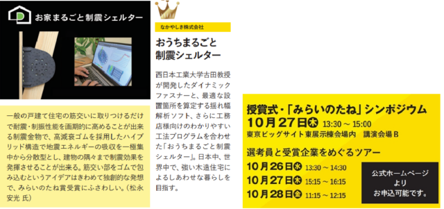 「みらいのたね賞」は、優れた建築を生み出すことに貢献しうる優れた製品、未来への布石となる製品を選考、表彰する企画で、Japan Home & Building Show2022の出展者が選考対象となる。HEAD研究会による「HEADベストセレクション賞」の開始から約10年にわたって、全国の様々な建材、設備機器などを幅広く取り上げてきた。