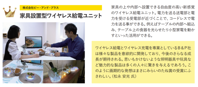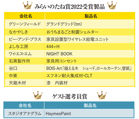 今年度の応募総数は約180点。第1次選考会でふるいにかけられ、9月12日の最終選考会で、9点が今回の「みらいのたね賞」の受賞製品として選出された[下表]。Japan Home & Building Show2022の2日目(10月27日)には、表彰式とともに選考員による選評やトークセッションなどのシンポジウムを開催。また展示会の期間中は、受賞企業ブースを巡るツアーも毎日行われる。選考理由や注目のポイントなど選考員の解説を聞きながら、各製品をチェックできる。多くのヒントを得られる機会になりそうだ。